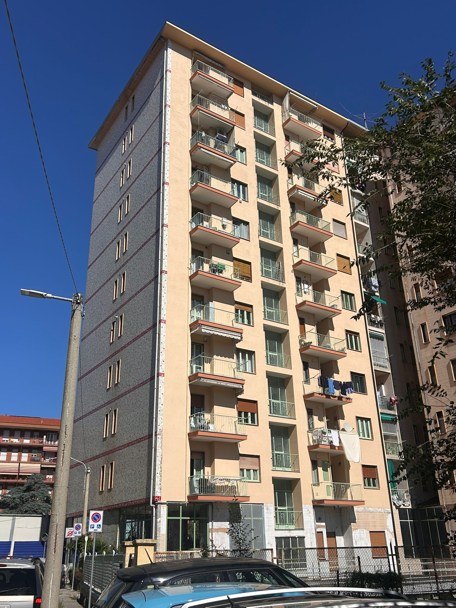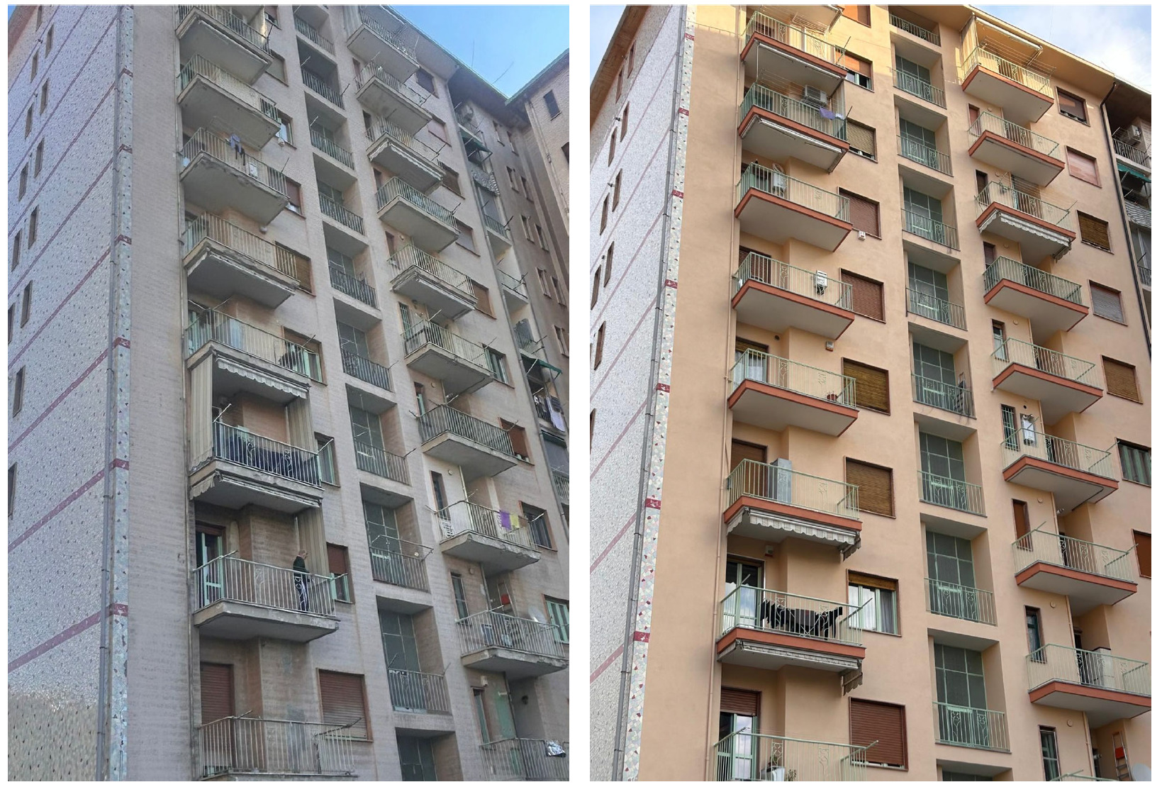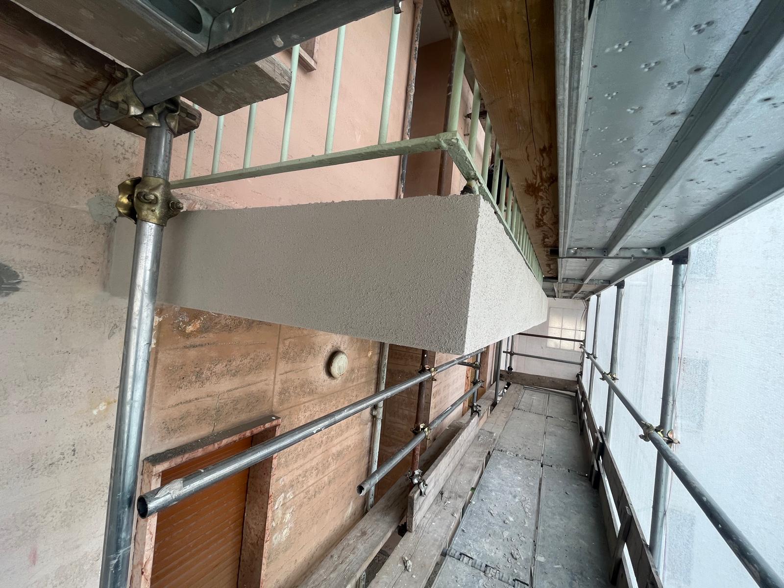 Intervento di restauro conservativo della facciata cortile del condominio di Corso Francia 155 a Collegno. Eseguite decorazioni e trattamenti protettivi sulle superfici in cemento armato. Realizzata rasatura e tinteggiatura integrale delle facciate intonacate. Completata la revisione e verniciatura delle opere in ferro di balconi e parapetti. Installato un nuovo isolamento termico del piano piloty, migliorando efficienza energetica e comfort abitativo.