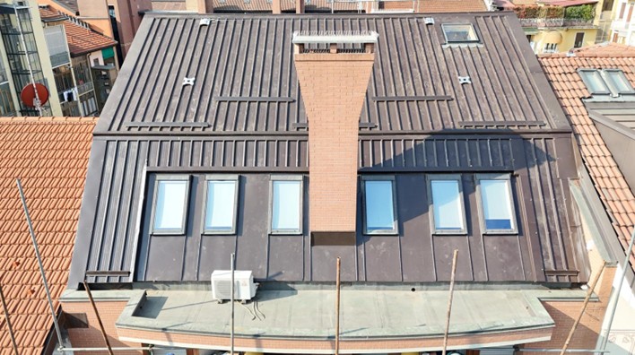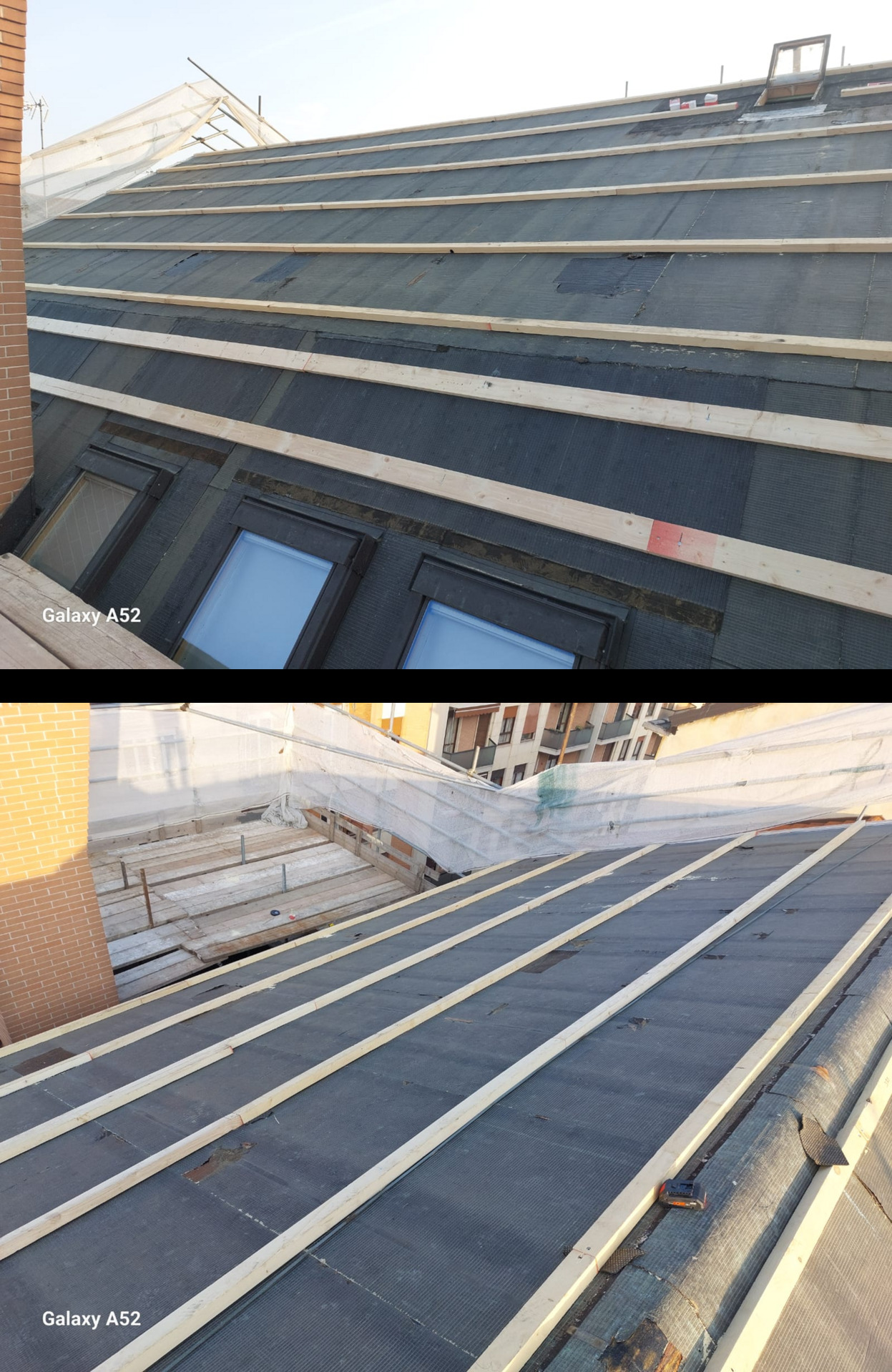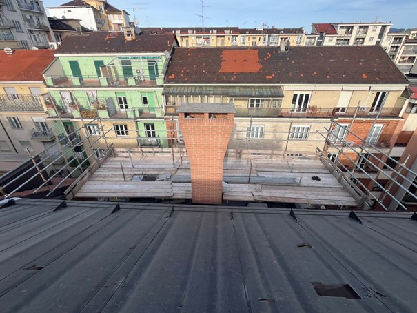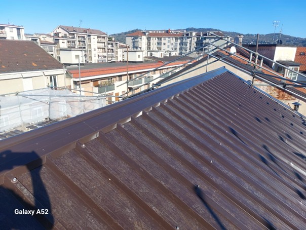 Intervento completo di rifacimento copertura su stabile residenziale: allestimento del cantiere e messa in sicurezza dell’area, installazione dei ponteggi, rimozione della vecchia copertura e realizzazione del nuovo tetto ventilato in lamiera. Il lavoro ha compreso posa della struttura di supporto, impermeabilizzazione, installazione di lucernari e cura delle finiture, per garantire maggiore isolamento, durata nel tempo e un risultato estetico moderno e funzionale.